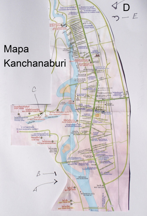 Ubytování: já vždy bydlím v Sugar Cane I. Mají zde bambusové bungalovy  v bezprostřední blízkosti řeky Kwai, vládne tu pohodová atmosféra a příjemná paní Pew, která má ráda Čechy.  Stojí za to jí zavolat ( tel.: 034624520), říct, že jste z Čech a zamluvit si bungalow za 250,- B za noc.  Dalším levným ubytováním jen o pár kroků dál je podnik Jolly Frog, který nabízí kromě levného ubytování i vynikající a levnou kuchyni a nejlevnější pivo ve městě.