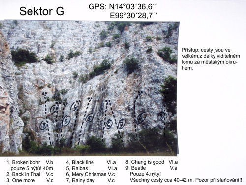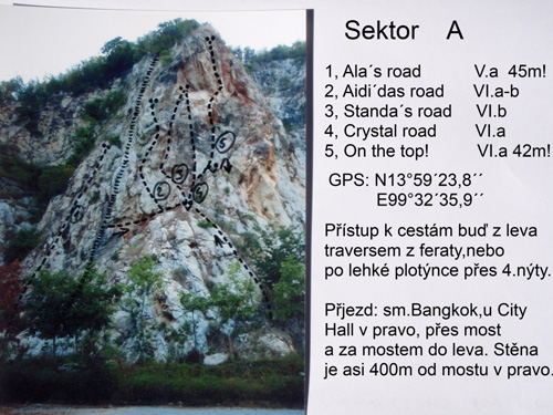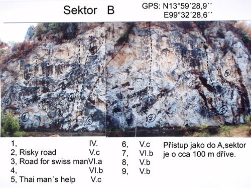 Z toho důvodu jsem se v Thajsku začal poohlížet po jiných lezeckých lokalitách. A protože mám takovou osobní slabost pro Kanchanaburi, hledal jsem možnosti lezení zde. K mému překvapení jsem našel v okolí města hned dvě lokality, kde již bylo dokonce několik cest vynýtovaných a tak už byl jen krůček k tomu nějaké další ještě přidělat. Během tří let, tedy zim, které v Thajsku snáším mnohem lépe, než v Čechách, se nám tu s kamarády povedlo vylézt asi dvacet nových cest. Cesty jsme zajistili nerezovými nýty, na konci každé dali řetěz. Pro svoje výstupy jsme si vybrali jak oblast označenou v mém (přiznávám,že značně primitivním, ale lepší neumím) plánku jako B, tak oblast A, která je asi jen sto metrů vlevo a  kde jsme našli dokonce jednu feratu vedoucí na temeno kopce a hlavně pak bývalý lom označený jako E.  Sektor D byl jen pokusem, ale skála je zde značně narušená a pro bezpečné lezení tedy zcela nevhodná.