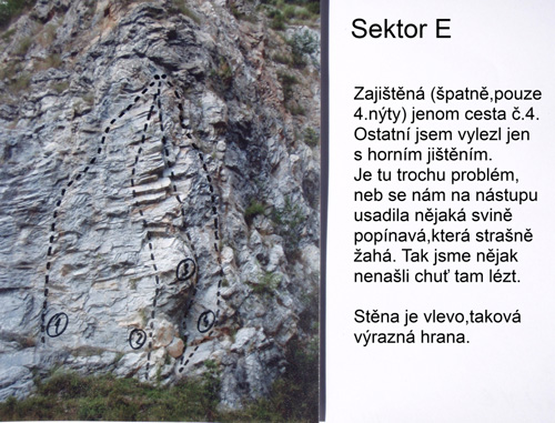 Při prvovýstupech jsme používali Spyty, které jsme tloukli pouze v místech, kde to bylo možné, tedy tam, kde bylo možné stát. Skála je zde totiž vrstvená směrem dolů, tudíž není možné použít fifiháček, trhliny, či spáry se tu nevyskytují. Takto jsme udělali asi první čtyři cesty, každou v délce cca 40 m, další jsme již vrtali z vrchu a následně přelézali. V oblasti E se jedná převážna o plotny, v oblasti A a B jde o stěnové lezení.
