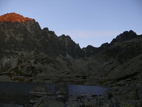 Ráno s námi jede ještě kamarád Jura, který nepoleze, udělá si tůru a příležitostně bude fotit. Cesta ubíhá rychle. Z Tatranské Polanky se necháme vyvézt na Sliezky dom a pak za svitu čelovek jdeme k Batizovskému plesu, kde jsme na východ slunce.