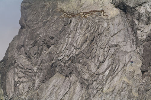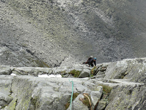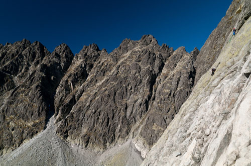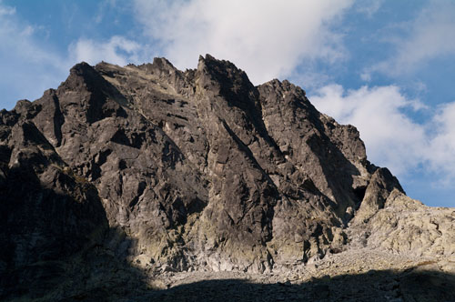 Je 11. září, včera v Tatrách sněžilo, zbytky sněhu tají a voda stéká přes obrovské plotny ve stěně Batizovského štítu, pravděpodobně ve směru našeho výstupu. Snad to nebude vadit.