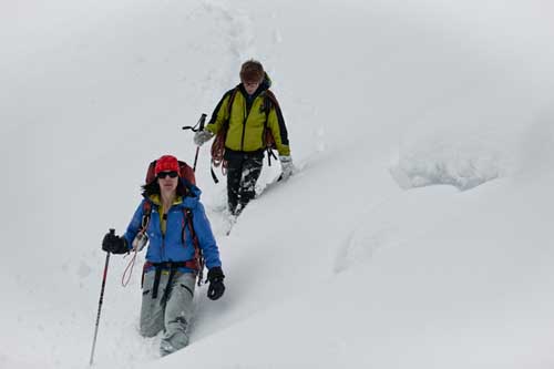 Nikdy jsem nelezla po tak zvláštně zabarveném ledu. Krápník nám připomínal nohy krabů, které nám den předtím k večeři uvařil Rudi. Navzdory tomuto velkému příjmu bílkovin jsem se cítila psychicky vyčerpaná, a protože ve skále šly založit jen mizerné malé friendy, odjistila jsem cestu pěti nýty. Na RP přelez jsme se vrátili druhý den a po několika pokusech jsme v přelezu uspěli.