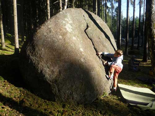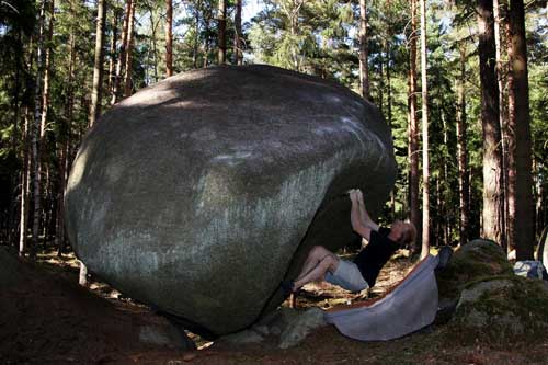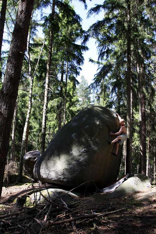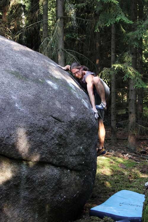 Tak ty 4 metry jsou spíš reálně 3,5 metrů, ale ten druhý boulder je opravdu dost velká věc. Rozhodně ale nikoli nebezpečná, spíš je parádní, že je tam zhruba osm vyrovnaných kroků. Nicméně budou tam věci i mnohem vyšší. Fakt pro srdcaře, sám jsem zvědavý, jak rozdýchám osmimetrovou plotnu bez chytů. Jen co bude podmínka, jedem brousit gumu.