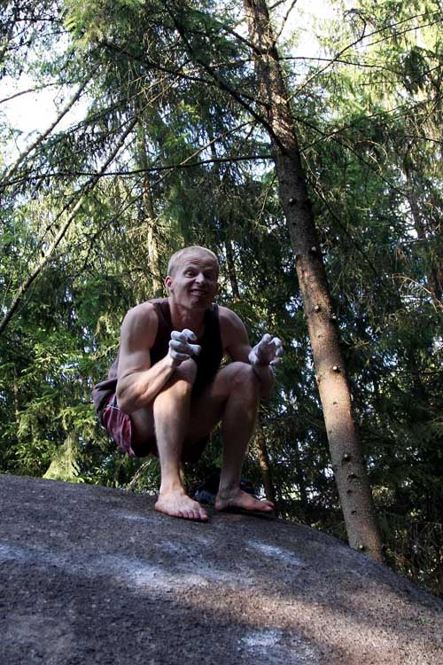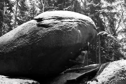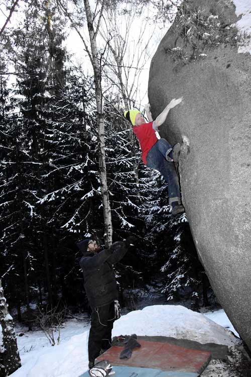 Zvyklý nezvyklý, nic jiného mi nezbývá. Když bylo rozumněji, měl jsem vždycky nějakou jinou práci a pak, když je trochu času, uhodí takové mrazy. Popravdě řečeno, je to hnus. Naučil jsem se s tím ale bojovat. V podstatě při teplotách nízko pod nulou existují dvě možnosti, jak s mrazem bojovat. Chceš-li strávit v oblasti delší čas, musíš si rozdělat oheň. To je skvělý základ. Rozehřeješ se, vytopíš boty a pak jdeš „přimrzat“ ke skále. A zase se můžeš vrátit do tepla. Takhle tě to tolik nevyčerpává. Druhou možností je existovat pouze z vlastního tepla, tzn. boty rozehřívat pod bundou, cvičit, hýbat se. Tohle ale stojí hrozně energie, což (v mém věku) znamená, dát tak dvě série pokusů v boulderu, pak už jedině delší trasu popojít jinam.