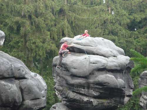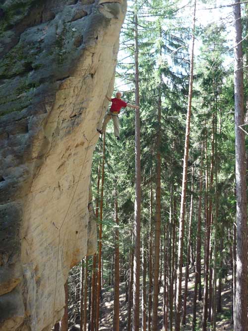 No tak děkuju, děkuju. Na písku trávím pravidelně týden na Ostaši a pak už jsou to jen nárazovky. Ale ono to lezení na písku zase tak vzdálené té „naší“ žule není! Co mi jde? Oblé chyty, hrany (dost si vážím „Utopie“ na Křižáku). Stupy na tření. Já mám obecně problém ustát malé ostré stupy. Vyhovuje mi stát na tření, objímat hrany apod. Tomu také přizpůsobuju lezečky. Nelezu v překroucených modernách tlačících veškerou váhu do jednoho bodu. Já tomu svému způsobu říkám „kačeří“. Tedy na všechno se snažím stoupat na plochu, pěkně to rozplácnout. Mimochodem také proto mi to bůhvíjak nikdy nešlo na umělé stěně. Jo a důležité – zhubnul jsem. Tolik, co teď, jsem nevážil ani v osmnácti. „Ošklivých“ 63 kg. Babička má o mě starost.