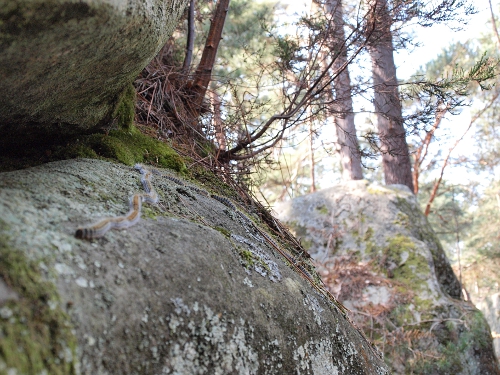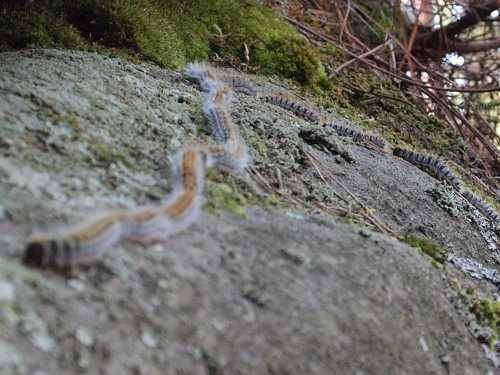 Housenky poznáte tak, že vytváří had a jsou hodně chlupatý. Kontakt s nimi případně s jejich štětinama (i nepřímý pomocí písku a bouldermatky) vyvolává nepříjemně svědící vyrážku. Já to bohužel okusil teď sám na sobě. Výskyt těchto potvůrek je víceméně v celé Francii, tak bacha na ně. Já blbec jsem si je ještě fotil ;)