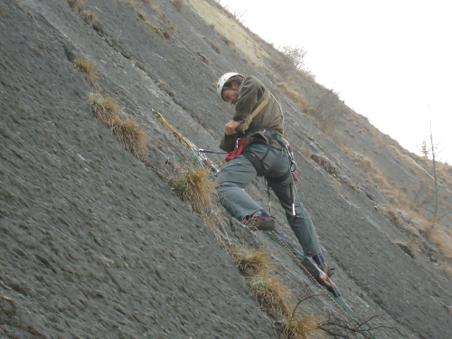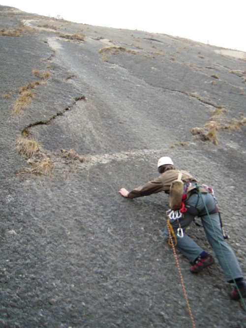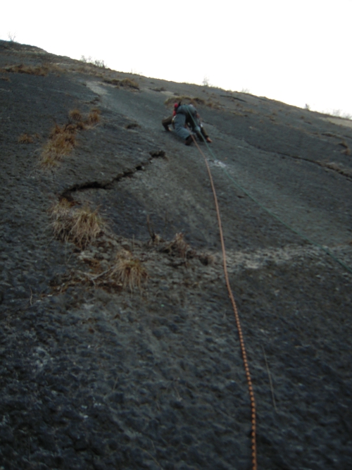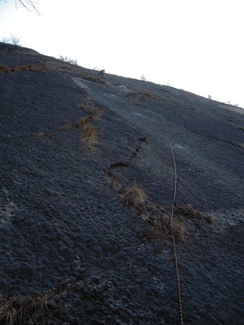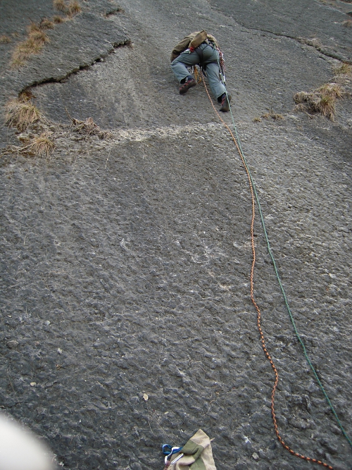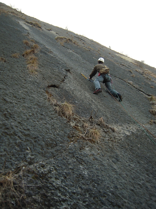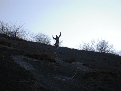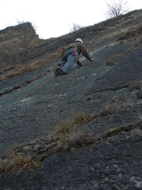 Během následujícího Marťanova lezení jsem ztratil pojem o čase, takže nějaké ty 2-3 hodiny shrnu pouze heslovitě: zima, slunce naproti v údolí, 5 kilo šutrů, 5 metrů nad nýtem, 3 (nebo 30?) kila šutrů, kilo hlíny, stojí dobře?, vrtá, 10 kilo šutrů, půl kila hlíny, 5 kilo šutrů, pár kroků, jde mu to, 5. nýt rutina, kde jsou šutry?, zrušeno, volný... ze slanění ještě něco omete a nová cesta je tak připravena k volnému přelezu.