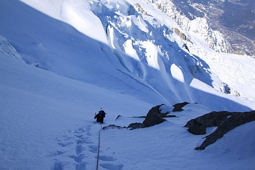 Den 4. Vstáváme brzy, ještě za tmy a aklimatizovaní vyrážíme vstříc novému dobrodružství. Jediné, co o cestě víme (nebo si myslíme, že víme) je, že vede přes dva vrcholy a dříve byla využívána jako druhá turistická cesta na vrchol Mont Blancu. Vzhledem k tomu, že jsme byli připraveni na žebro Brenvy, jsme přesvědčeni, že výstup zvládneme. Nejdříve nás čekal  průstup ledovcem na severovýchodním svahu Mont Blanc du Tacul a výstup pod jeho vrchol ledovo-firnovým hřebenem. Vše probíhalo docela hladce, brzdil nás jen místy hluboký sníh a naše tunové bágly. Postupovali jsme s jedním půlkovým lanem, když jsme nelezli, tak jsme ho měli mezi s sebou 2x. Pod vrcholem Mont Blancu du Tacul (4150 m) se nám otevřel výhled na Mont Maudit. Když jsme se dívali na jeho svahy, a posuzovali jej jako překážku v cestě na Mont Blank, říkali jsme si, kudy ta cesta asi vede? A vede to vůbec tudy, vždyť to vypadá dost neschůdně? Zvolili jsme cestu východním hřebenem. Věděli jsme, že bivaku ve stěně se nevyhneme, ale nijak nám to nevadilo.