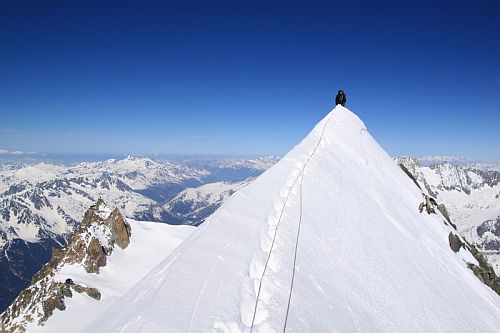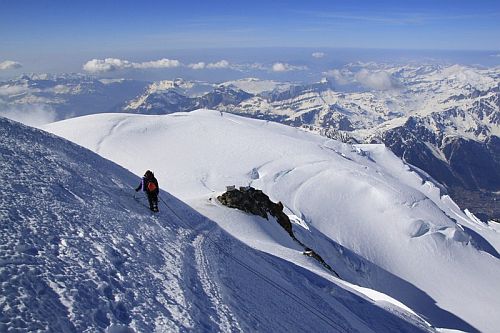 Den 6. Nesporně chceme zdolat vrchol a spát na Valotce. Deme na to, zase hluboký sníh, nadáváme, klejeme, ale pomalu se dereme dál. Výšvih do Mur de la Cote (4485m) je víceméně ledovo –firnový výstup. Je třeba být velice opatrný, ale jistit se nám nechce. Ujišťujeme se navzájem, že nebudem padat. Nikdo nechce být stažen svým spolulezcem, být uškrcen ve směsici lan a najít svou smrt pod tímto výšvihem. Vrchol již vidíme, není to daleko - zdá se v křišťálově čistém vzduchu -  a tak další hodinu  a půl stoupáme k vytouženému cíli. Již vidím vrcholový hřeben, jsem asi 50m od něj a naplňuje mě radost. Čekám na Michala a spolu stoupáme závěrečné metry. Kolem nás létají vyhlídková letadla, máváme jim, aby měli radost, abychom my měli radost, a oni nám mávání opětují. Dosáhli jsme vrcholu Mont Blancu. Jsou dvě hodiny odpoledne, jsme zde úplně sami a náležitě si to užíváme. Při sestupu jsem stále navázáni, buď je to hřeben, nebo prudký svah, led, sníh, firn. Sestupujem na Valotku. Pomalu, bezpečně, na jistotu. Nemá cenu, aby se nám teď něco stalo. Valotka nás překvapuje, plechová bouda, blbě se do ní leze a je tu bordel a odpadky. Nicméně zde nefouká a je tu dost místa, vaříme hodně čaje i jídla.