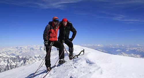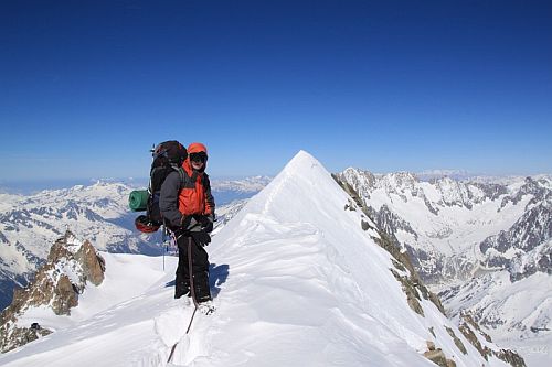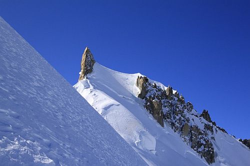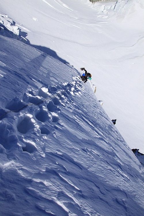 Den 5. Odhaduji, že spíme ve výšce kolem 4200 m. Noc je mizerná, spíme v sedáku, navázaní na laně, Michal se tiskne ke skále a já k němu. Když se otočím na levý bok a schoulím do klubíčka tak mám prdel nad 200 m srázem, ještě, že mám odsedku. Pod hlavou batoh s botama, jinde není místo. Sem tam pozoruji hvězdy, ne, že by se mi nechtělo spát, ale mrznou mi nohy. Konečně přichází ráno, nevaříme, obouváme zmrzlé boty a rychle odlézáme dále. Zase hluboký sníh a v tom schované šutry, no aspoň se dá jistit. Po pár délkách dolézáme na ostrý hřeben a v dálce vidíme vrchol Mount Maudit. Nedá se nic dělat, musíme tam, jen přes něj vede cesta na vrchol Blancu.  Střídají se ledové plotny, ostrý hřebínek a hluboký sníh. Poslední délka stojí za to, ledový odtrh lemuje vrcholovou špici. 2 Metry od skal je led a já už mám mačky tupé, a bojím se pádu. Michal leze první. Z poza hřebenu mi dává signál, že mě jistí. Odlézám ze štandu, nad sebou 60m lana a pod sebou 2 m ledu a pak teprve firn, musím se dostat na firn a nespadnout jinak to bude kyvadlo jako sviňa, s báglem, mačkama a cepínama, radši ne. Dolézám k Míchalovi, ten v klidu sedí ve sněhu za hřebenem, jistí a sděluje mi, že viděl orla. Nevnímám, jen se raduji, že jsme na slunečné straně a užívám si tepla. Na vrchol Mont Mauditu (4465 m) je to jen pár metrů, tak se tam jdeme podívat. Michalovi při tom vypadl mobil a vesele putuje do doliny, a aby srandy nebylo málo, tak deset minut na to, když chceme slaňovat o šutr, Michal háže do doliny i lano. Naštěstí se zachytilo o kameny asi 20m pod námi, takže situace v klidu. Scházíme do sedla Brenvy (4303 m) a budujeme místo na stan.