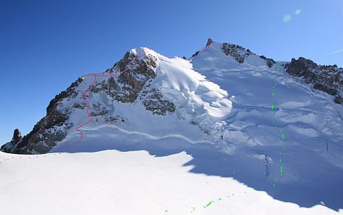 Mont Maudit (MM), zeleně-běžná trasa, červeně-naše trasa, žlutě-bivak.