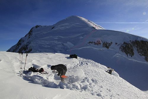 Michal v sedle Brenvy tvoří místo na stan, v pozadí Mont Blanc (MB)