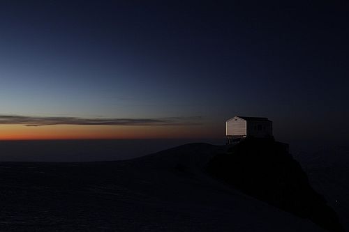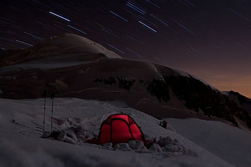 Den 0 – 1. Ve čtvrtek večer 22. března odjíždíme (vím, to už je jaro, nicméně podmínky byly zimní) a po 13 hodinách jízdy parkujeme v Chamonix. Rychle ověřujeme počasí a podmínky v domě horských vůdců. Na poznámku, že budeme potřebovat lyže nebo sněžnice nereagujeme, protože je nemáme, a lanovkou vyrážíme na Aiguille du Midi (3 842 m). Naším dnešním cílem je Bivouac de la Fourche (3 684 m). To znamená postupně sestoupit do asi 3 400 m a pak opět vystoupat. Navíc bivak je vybudován na docela ostrém hřebínku, sníh je hlubší, než by si člověk byl myslel, slunce pálí také více než běžně a čas běží rychleji. Zkrátka, již potmě vybalujeme spacáky a bivakujeme pod širým nebem na ledovci, asi 200 výškových metrů pod bivakem. Nad hlavou spousta hvězd a Grand Capucin, který dohlíží na naše klidné spaní.