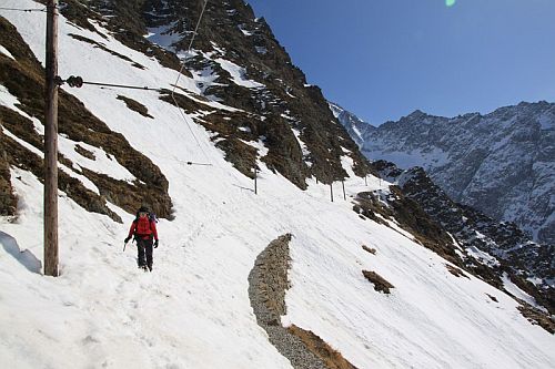 Den 2. Slunce se nám vtírá do spacáků a nenechá nás spát déle než je třeba. Vaříme pití, tajeme a Michalové se pomalu v hlubokém sněhu prodírají pod kuloár, kterým chceme vystoupat k bivaku. Začátek jde velice ztěžka, je třeba překonat ledovcový odtrh, který dělí firnovou stěnu a nás asi metr širokou a vysokou dírou. K našemu překvapení jeví přístupová cesta značný odpor, místy ledová plotna jistitelná šrouby, místy hluboký sníh, celkem asi 5 délek, no docela výstup. Ani výška, ani únava z předchozího dne nám nepřidávají na síle, takže u bivaku jsme asi kolem 16 h. Všichni se těšíme na jídlo a zasloužený odpočinek.  Mě ještě trapně spadla rukavice jednu délku pod nás, takže když kluci vaří a odpočívají,  já si ještě užívám ve stěně.
