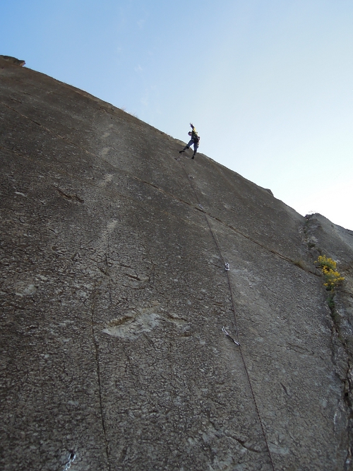 Dnes bylo hodně zima (lehce nad nulou) ale dobré tření (na nástupu jsme debatili jestli Rešík zrovna něco nepokusuje). Bejbs to zkusil rovnou zdola, prsty mrzly ("když necítíš co držíš tak zabereš za všechno") a slunce ne a ne se přehoupnout zprava do stěny. Zařval si v ní čtyřikrát, ale povedlo se a je to tam: "Mistr nebo žák", navržená klasifikace 9, přirozená cesta, která nemá žádné definované nebo zakázané kroky.