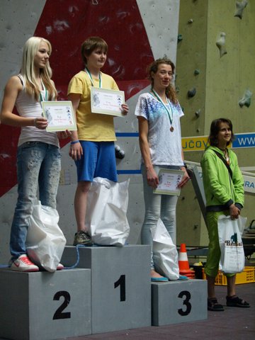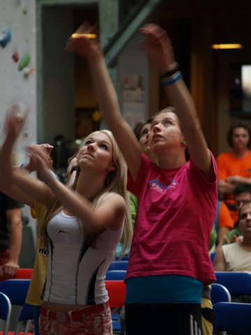 Ženy (lépe řečeno jedna žena a tři juniorky) začaly též spíše technickou cestou s převisem po lepších chytech ve střední části. Topové madlo poždímaly dvě lezkyně, tedy celých 50% účastnic. Děvčata se pak přemístila pod nástup první kvalifikační cesty mužů a rozhodně se nenechala zahanbit předchozími výkony opačného pohlaví. Terce i Andree do topu chyběly milimetry…