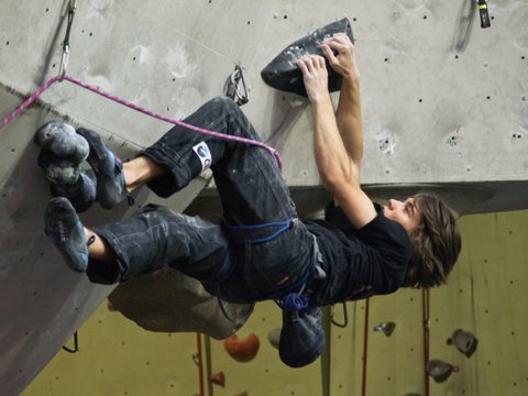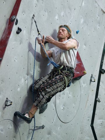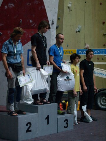 Následoval maraton pro stavěče, kteří museli sundat finálovou cestu žen a připravit finálovou cestu mužů. Příště sakra míň chytů! (poznámka č.2 autora – stavěče) 12 rozhněvaných mužů čekalo v izolaci, než s Ferem našroubujem poslední chyt a hurá na obhlídku cesty. Ten volant pravou nebo levou? ..Hm nejspíš oběma… Šest minut je pryč, tak šup zpátky do cely! A pak do onsajtu! Tentokrát však topový chyt zůstal panensky černý bez maglajzového obtisku vítězovy ruky. I tak borci předvedli úctyhodné výkony. Hlavně Jirka Dragoun zanechal výborný dojem. V jeskyňářsky ležérním autfitu si dolezl pro stříbro. A kdo ví, jak by to dopadlo, kdyby místo cvakání expresky lezl dál… Vítězem se stal Tomáš Binter, který místo cvakání ušetřil pár gramů síly a udělal ještě jeden rozhodující krok navíc.