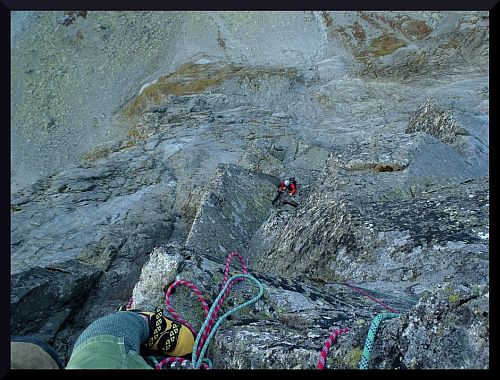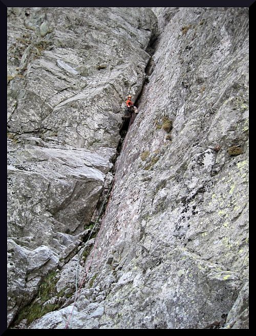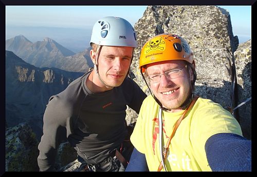 Ráno vyrážím za slunečného počasí z Brna, Kubu nabírám v Olomouci a za nějaké ty 4 hodinky už mašírujeme na Popradské pleso s baťúžkama hezky nacpanýma železem, lany a pro jistotu i kompletní bivakovací výbavou. Podle hesla potřebuješ zrovna to, co nemáš, jsme toho vzali raději víc, s tím, že taková expedícia si žádá oběti. Na Popradseehütte poobědváme nějakou tu tyčku, klobásečku, špícek a už frčíme jenom s matrošem pod Ostrvu. Jako první cestu jsme vybrali Diešku (7-), toho jsme si chtěli vždycky vylézt a Kuba v něm dokonce kdysi zavěsil pytel, ideální cesta na odpoledne, aby se člověk po cestě autem hezky rozhýbal. Trochu nás překvapil šestkový koutek v druhé délce, který je těžší než se zdá. Nejkrásnější je ale čtvrtá délka - luxusní kout, do kterého jde dobře založit - hodí se větší friendy a ve výlezu je dokonce borhák! Po dolezení délky (zde končí také pěkná sportovní cesta Správny čas - 8) slaňujeme cestou zpět a spokojení s prvním úspechem se vracíme do BC.