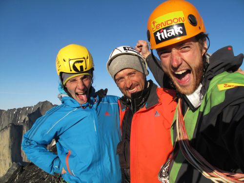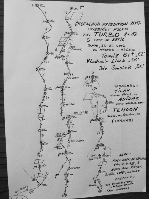 Pri spiatočnej ceste sme boli nakoniec radi za tutové štandy v Novej ceste, ktorou sa dá krásne zlaniť celá stena priamo dole. Na vrchol Ketilu sme doliezli 25. 6. 2012 po dva a pol dňoch lezenia. Na Ketile ešte žiaden Slovák ani Čech nebol, tak máme radosť jak sviňa!