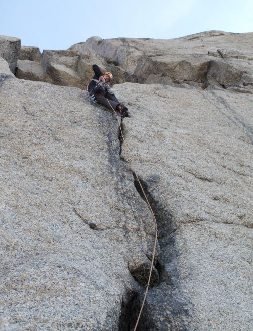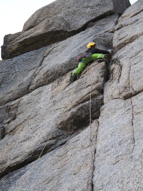 Zohnať informácie o tejto žulovej hore je ako hľadať ihlu v kope sena! Stáli sme pod južnou stenou a jediné čo sme vedeli je to, že by tam mala niekde viesť nejaká stará cesta. Línia sa našťastie dala jednoducho vytušiť a už po niekoľkých sto metroch spoločného nástupu sme našli starú skobu, ktorá potvrdila naše predtuchy. Spodnú časť steny pretína zľava doprava výrazná porucha, ktorou sme sa dostali do veľkého ypsilonu. Tu sme opustili Starú cestu, ktorá pokračuje ďalej doprava a vydali sa priamo stredom ypsilonu svojou cestou k vrcholu. Po dvanástich dĺžkach nás čakalo prekvapenie v podobe tutového štandu z dvoch nitov previazaných slučkou. Čumeli sme ako péro z gauča, že čo sa deje?! Niektoré ďalšie dĺžky boli tak jasné, že nemalo význam kľučkovať popri logickej špáre holou platňou len aby sme liezli svoj smer a tak s touto, nazvime ju Novou cestou máme nakoniec asi päť spoločných dĺžok.