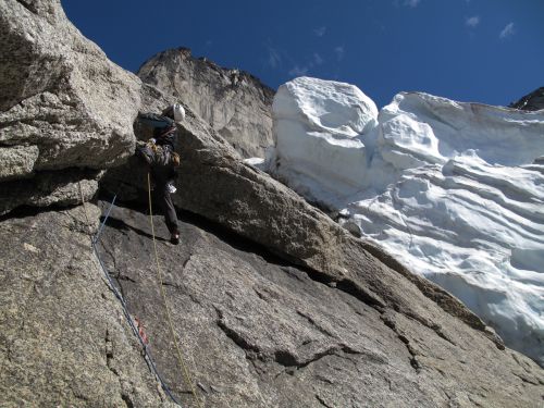 Táto stena si ma vyhliadla pred rokom a hneď si ma omotala okolo prstu. Nemal som šancu a už ďalší rok som sa proste musel vrátiť. V spodnej časti steny nevedie žiadna súvislá porucha a tak prekľučkovať kompaktnými platňami bol celkom slušný oriešok na začiatok tohto 8 dňového vertikálneho blues. Aby sme neriešili len lezecké problémy, tak si počasie povedalo, že nás trochu preverí a na tri a pol dňa nás uväznilo pod previsom. Našťastie sa na Brťákove narodeniny zľutovalo a doprialo nám jeden deň na vrcholový útok. Na tento vrchol vedú iba dve cesty a z toho jedna je naša, takže radosť neskutočná. Mali sme šťastie ako sviňa, lebo po tomto peknom dni prišli ďalšie tri dni totálneho pekla. Osmy deň sme si zase zbalili tie svoje fidlátka a v daždi zlanili na zem.