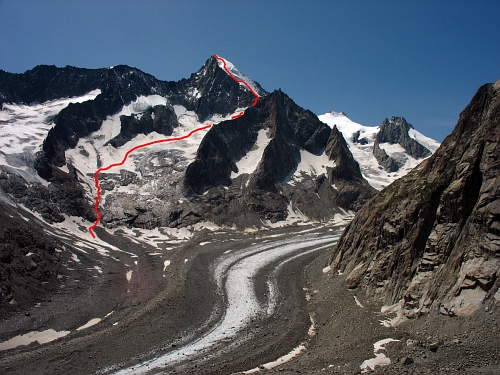 Máme 3:30 ráno a z vedlejšího stanu se ozývá Pitel, aby mě vzbudil, protože můj budík opět stávkuje. Jarda, se stávkujícím lýtkem, taky vstává, aby nám uvařil čaj a popřál hodně stěstí. Čeká nás 3822 m vysoký Nesthorn, resp. jeho východní hřeben ohodnocený stupněm D-, tedy asi III-IV ve skále a nějakých 70 stupňů v ledu, převýšení asi 1400 m. Počasí má být podle chataře z Oberaletschhütte dobré, tak se těšíme na krásný výstup na krásný kopec.