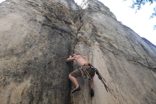 Rád bych zkusil ještě Úzkou spáru VII na Ottovu ale druholezec by si s ní asi neporadil. Volba tedy padne na Východní hranu VIIb na Mravenčí. Přibližně v pěti metrech nevím co dál, slézám, promýšlím. Napodruhé se mi podaří založit uzlík a postupuji vzhůru. Až u včelího hnízda si vzpomenu, že mě před ním minulý den varovali. Dlouho váhám s postupem, ale nakonec dosahuji prvního kruhu. Následuje vypečený traverz po jemných chytech s hrozícím kyvadlem. U druhého a třetího dobírám a záhy jsme nahoře.