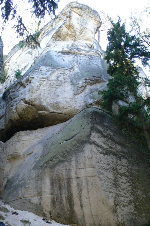 K rozlezu si ještě vybíráme Údolní cestu VI na Trio. Ve stěně i později se mi zdála těžší než tvrdí průvodce nicméně hvězdičku má právem. Asi chybí technika. Druholezec musí kousek vyručkovat ale zanedlouho stojíme oba na vršku. Jenže ouha, slaňák a knížka je kapánek vedle. Ještě pořád nejsme zvyklí na přepady mezi vršky a dolezy ke slaňákům. Po chvilce šaškování slaňujeme a scházíme naboso svahem plným šišek.