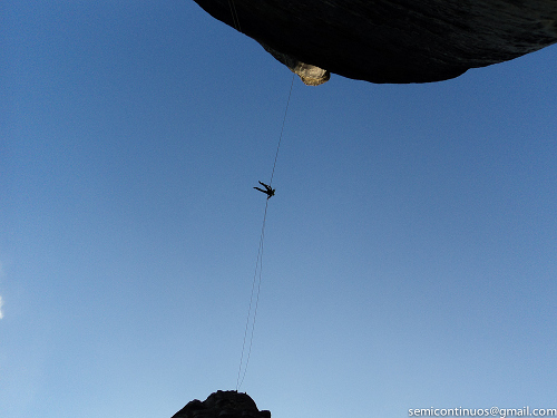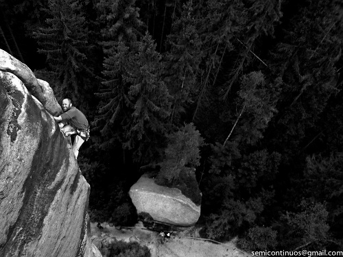 Následovalo několik filmů, z nichž nejvíce zaujal Špátův Okamžik radosti, zejména historické záběry výstupu na Hlásku, stavění na Velrybě a hlavně duch filmu vyjadřují dle našeho soudu to, co v pískovcových skalách hledáme nejčastěji a je úplně jedno jestli v tradičních nebo moderních sportovnějších cestách. Večer jsme pak zakončili několika kratšími Polákovými filmy z prvovýstupu Napříč Saharou na Mauglího nebo například unikátní film z pokusu o Kienovu houpačku z Konšela do přelanění mezi Starostou a Starostovou. Rozhodně zajímavé videjko po jehož zhlédnutí bych neporučoval o něčem podobném ani uvažovat.