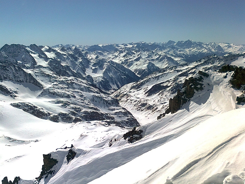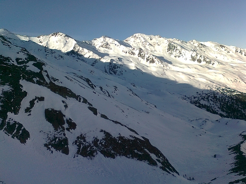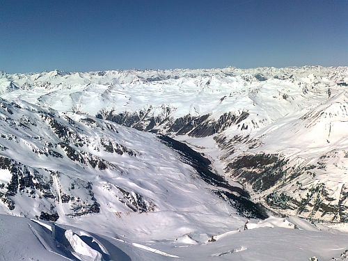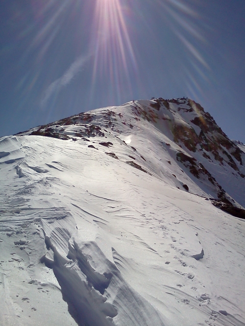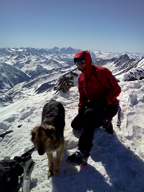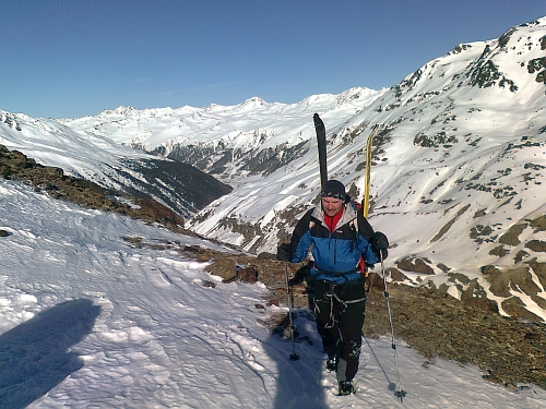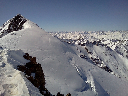 Výhledy z vrcholu jsou kapitola sama. Na dlani západní část Ötztálských Alp, Nauderer Alpen, Samnaungruppe, vrcholky Silvretty, na jih Ortler, v dálce Bernina a téměř na dosah Weisskugel – Palla Bianca. Marek s obdivem ostatních vyšlapal nahoru s freeridovými lyžemi s vložkami na chození a Luboš sic marně hledal ztracenou fyzičku z atletiky, seznámení se skialpinismem však začal obdivuhodně. Trochu na káry po 1.600 výškových metrech (kdo by nebyl s úzkými mizernými pásy), ale jako otec rodiny měl omluvu. Po rekuperaci sil během polední vrcholové siesty jsme se vydali na sjezd. Tentokrát žádný med. Vítr na ledovci vyfrézoval všelijaké roztodivné tvary, které dost dobře bránily nějakému solidnímu sjezdu. Prostě styl kamzičí zvěř. Hutnější prašan byl jenom ve dvou stinných místech. Holt to tak někdy bývá. Po tvrdých deskách trochu krusty a dolů od morény jarní firn.