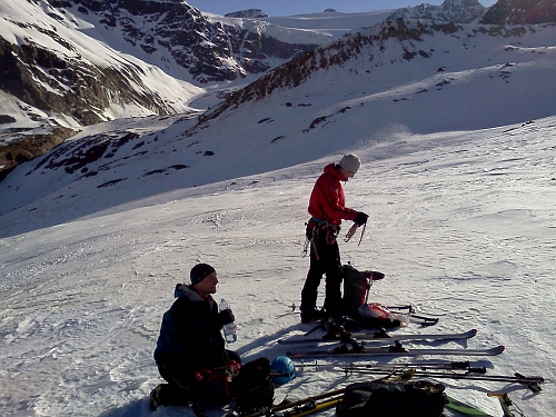 Vzorově po půl šesté jsme dojeli na parkoviště v Melagu. Oblohu plnou hvězd prozářili pouze reflektory několika aut na svoz mléka. A po šesté jsme již klouzali ke stavení Melager Alm 1.970 m. Z jižních svahů sjeli do údolí menší základové laviny. Za domy z preparované stopy zůstala jen úzká pěšinka, která řídkým lesem začala výrazněji nabírat první výškové metry. Za lesem jsme se drželi více vpravo a postupně vystoupali na ostrou hranu morény připomínající dračí hřbet v mapě pojmenované Bergl. Tady jsme na několik málo minut museli sundat lyže, protože sníh zde stál. S postupujícím jarem se úsek s lyžemi na batohu bude prodlužovat. Po moréně jsme došli pod nevýrazné čelo ledovce Bärenbartferner. Za zády sluneční paprsky ostře ozařovaly stěny a svahy Weisseespitze. Přes údolí na protilehlé straně se nachází chata Weisskugelhütte, která je otevřená pouze v letních měsících. Její poloha není pro skialpinisty úplně výhodná.