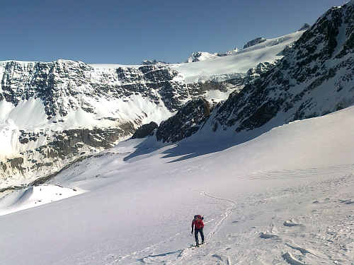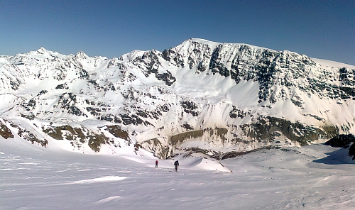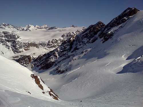 Přešlapovali jsme nad stěnou Vernagl Wande a mezitím padali chytré návrhy na sjezd (spíše skok) do údolí na ledovec Langtauferner a po něm za dvě až tři hoďky na vrchol. Samozřejmě všechny naše výplody byly totální kraviny. Skialpová cesta na jih tímto směrem žádná ani pro vskutku odvážné jedince nevede. V mapě je naznačen něco jako turistický chodník, ale ten bych nechal raději na léto. Při špatném počasí to může být sakra průserové místo! Mimo samotné dominanty výrazně zaledněného hlubokého a dlouhého údolí vedly skialpové stopy na vrchol Bärenbartkogelu 3.400 m. Hned mi bylo jasné, že se do toho údolí musím někdy podívat. Ale kdy? Příjezd je dost oklikou přes Itálii, to se asi hned tak někomu nebude chtít.