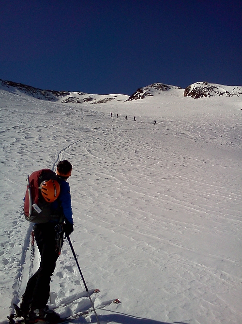 O popularitě túry na Bärenbartkogel svědčila dobrá stopa na ledovci a další necelá desítka skialpinistů ve všední den, kteří nám později funěli na záda. Jak se dalo již z mapy vyčíst, profil ledovce byl mírný a šlapalo se po něm velmi příjemně. Navázání jsme nebyli my ani ostatní. Až v horní polovině ledovce nás začaly intenzívně smažit sluneční paprsky. Tlačili jsme se západně k bočnímu hřebeni do malého sněhového sedla. Z něj obtížněji na lyžích (dle sněhových podmínek, na několika místech trochu exponované) nebo na mačkách po hřebeni na vrchol, který se ukáže až v posledních metrech výstupu. Bärenbartkogel má několik vrcholů, ale nejčastěji se zřejmě chodí na ten centrální (Cima Barba d´Orso). Na vrchole jsme byli v rozmezí 11 až 12 hodiny. Naše tempo však bylo velmi pohodové a nikterak jsme nespěchali.