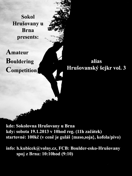 "Na vědomost se dává, že bouldr závody v Hrušovanech u Brna letos opět se chystají. Tentokráte obtížnost lehká bude, neb těžké bouldry stavěti kdo nemá. Bouldrů postaviti pokusíme se, co se do Vás vejde. Toto vše se započne 19.1.2013 v hodině desáté až půl jedenácté a ukončí plným pupkem píva a goulageho.