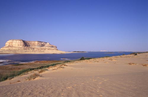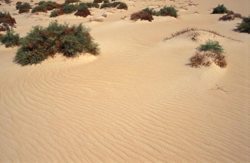 Právě se probouzím po polední siestě v hrozném vedru našeho jedno či možná i dvouhvězdičkového hotelu (mimochodem jedna noc pro dvě osoby zhruba za 40 Kč) s tekoucí vodou (pouze teplou). Honza si zrovinka něco smolí do deníčku a ve vzduchu je cítit hrozná nuda, vždyť tady kolem už není nic zajímavého co jsme ještě neviděli. V tom si Honza prohrábne vous tužkou, ušklíbne se když mě vidí rozespalého a škodolibě nadhodí že zbývá jedině ta velká stolová hora. A já na to, že teda jo, kdy vyrazíme. Honzovi vypadla tužka z ruky a sedí beze slova zírajíce na mě a nevěříce vlastním uším dávno již se totiž rozloučil s představou tripu do pouště (to se mi ho zase jednou povedlo řádně vykolejit, chichi). Vzhledem k tomu, že je již odpoledne, fofrem balíme potřebný matroš (tj. spacáky, foťáky, jídlo a vodu – nic z lezeckého vybavení nemáme, jsme přeci normální cestovatelé!). Honza se ještě pro sichr vyptává hoteliéra zda není pro trip do pouště potřeba nějaké zvláštní povolení a zda není zakázáno na horu lézt (třeba z vojenských či náboženských důvodů). Hoteliér nevěří svým uším, takový nesmysl, kdo by na horu lezl? Proč? Nakonec říká, že je to naše věc a asi si myslí, že blouzníme z vedra, takže nám již více nevěnuje pozornost. Filtrujeme ještě rychle vodu (10 litrů by mělo stačit) a vyrážíme opět jenom na lehko, jedna poloprázdná gema a malý batůžek převážně vyplněn fotoequipmentem. Nasazujeme ostré tempo, neboť mapy nemaje nevíme jak je to k hoře daleko a nechceme skončit blouděním v noci kdesi v poušti. Na konci oázy končí cesta tak jdeme podél odsolovacího kanálu směrem k hoře, jedinému orientačnímu bodu v dálce. Pochod skutečnou pouští je sám o sobě zajímavý, místy je písek hrubší, jindy jemnější tvořící drobné vlnky ve kterých jsou zřetelné stopy všelijakých živočichů, avšak nikde kolem ani živáčka. Ten jemný písek se trochu boří a když se jde do kopce (i mírného) tak to klouže….
