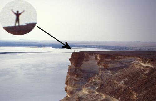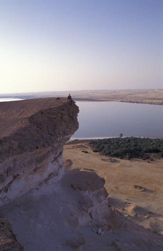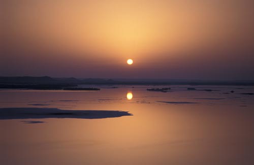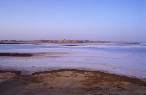V oázce nacházíme cestičku, klikatící se skrzeva vysušenou část jezera a místní vegetaci. Potkáváme domorodce s mačetou v ruce, který se na nás přátelsky šklebí a ukazuje nám svůj jediný zub. Sice si navzájem nerozumíme ani slovo, ale nakonec nás obdarovává každého granátovým jablkem a my pokračujeme dál a on si lehá pod přístřešek z palmových listů. Po chvíli již opouštíme oázku a stáčíme se k úpatí hory. Potkáváme dvě malé děti, které se při pohledu na nás rozbrečí a okamžitě prchají někam do vegetace. Dva vysocí bílí sáhibové, to je muselo opravdu vyděsit. Konečně jsme na úpatí hory ovšem k našemu zklamání zjišťujeme, ze hora je příliš strmá a nedá se na ni z jižní ani západní strany vylézt. Kolmý úsek je zde alespoň 10 metrů bez jediného chytu, bída. Začíná zapadat slunce tak jdeme směrem k severní straně s nadějí, že tam snad najdeme úsek který by bylo možno zdolat (chceme totiž přenocovat nahoře). A skutečně, na severní straně je relativně mírně strmé šotolinové pole které vede přímo k hoře asi tak do výšky 50 m nad okolním terénem. Jakmile dorazíme až k samotné stěně, naše radost se rozplývá, jelikož zde opět začíná pětimetrová úplně kolmá hladká stěna z bílého kamene, který poklepem duní a nahoře končí úzkou traverzou ze směsice napěněné hlíny (kdo jste někdy dělal šlehačku z hlíny, víte o čem je řeč). Honza už to balí a začíná fotit západ slunce nad solným jezerem. Podívaná to úžasná, avšak já shledávám, že nenastaly ještě ty správné světelné podmínky na špičkové záběry, tak se ještě vydávám dále podél stěny s nadějí, že najdu nějaké slezitelné místo. A taky že jo, velké štěstí, našel jsem jedno jediné místo, kde je kolmá hladká stěna jenom něco přes tři metry vysoká, takže při troše spolupráce by se nám mělo podařit tuto první překážku zdolat. Co však následuje dál nevíme a tak vzhledem k tomu, že se povážlivě rychle stmívá, odkládáme vystup na zítřek. Nedaleko zmíněného místa se také nachází malá vodorovná plošinka, jediné rovné místo v okolí, na kterém se dají při troše dobré vůle rozbalit dva spacoše. Takže vybalujeme, já jdu fotit konečně ten západ slunce a večerní solné jezero, které najednou vypadá jako by bylo pokryté ledem a sněhem. Pozoruhodné.