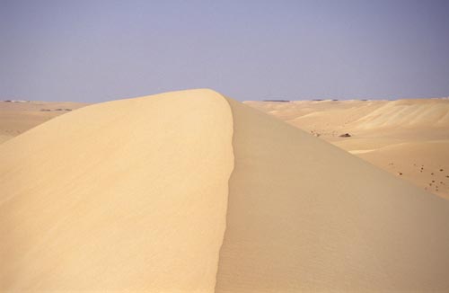 Jdeme tedy cestou zpět po našich stopách, avšak v oázce zabloudíme a tím se dostaneme nenadále k jakémusi bazénku s minerálním pramenem. Právě včas. Okamžitě začínáme filtrovat vodu a záhy máme opět plných deset litrů, což by mělo na den v poušti stačit. Rozradostněni nalezením vody, vracíme se zpět do pouště. Navrhuji vylézt na velikou písečnou dunu v dálce a Honza nic nenamítá. Duna se zdá být tak 2 km daleko, ale po dvou hodinách chůze se nijak nepřibližuje. Za další hodinu jsme u ní. Odhadujeme její výšku na takových 50 až 80 metrů. Je velmi dlouhá a její vrcholová hrana je super ostrá, navíc se to dost boří. Po dosáhnutí vrcholu sbíháme dolů (škoda že nemáme surf nebo tak něco). Pak již se opět vydáváme v poledním žáru směrem k oáze Siwa, hodláme se cestou ještě zastavit na minerálními prameny vyhlášeném Fantasy Island, a ani netušíme jaké fiasko jsme způsobili naším zmizením v oáze, ale to už je úplně jiná story…