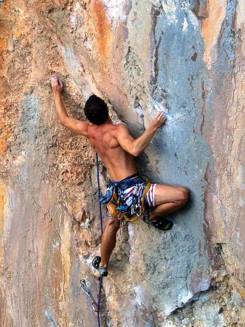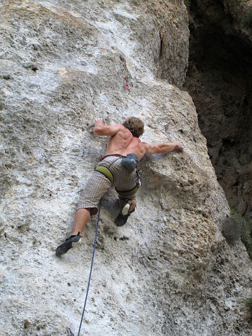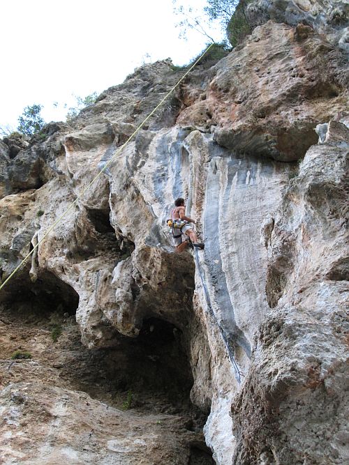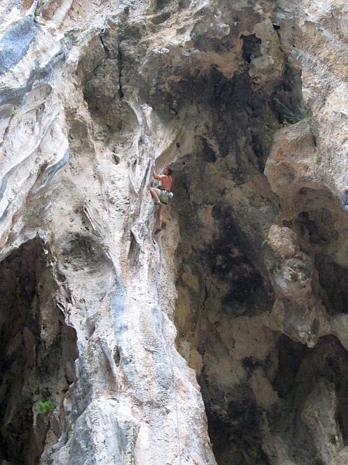 Lezení začínáme v jeskyni Magara, která je hned naproti dlouhé řadě krámků nad korytem vyschlé řeky. Je zde několik celkem pěkných cest s vypečeným cvakáním poslední expresky, kde se převis mění ve strop. Protože si chceme před odjezdem stihnout ještě trochu zahrotit, zkoušíme cestu Bad Karma (7b). Spodní pasáž s několika zajímavými kroky ještě celkem ujde, ale nahoře je to takové zoufalé plácání po dvou tufách na stisk. Já mám ovšem na vymýšlení sekvencí lidi, takže nechám veškerou objevovací a zkoušecí činnost provést Vojtu, který správý program nakonec odhalí, a ve třetím pokusu si odnáší zápis do deníčku. Já to zkouším několikrát, z počátku zoufalství, následně se to zlepšuje, ale přelez stále nikde. Pak začne do sektoru svítit sluníčko a my chtě nechtě mizíme k moři.