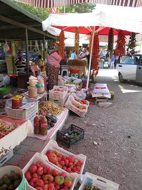 Mírným problémem Geyikbayırı je, že zde v podstatně neexistuje obchod, kde by se daly nakoupit potraviny. Lidé z kempu nás odkazují na pravidelný nedělní trh v asi 10km vzdálene vesnici Pazar. Pěšky je to moc daleko, ale stopování prý není problém. Po čtvrthodince stopování nám zastavuje plně obsazená dodávka s tím, že si máme všichni čtyři naskočit na korbu. Po cestě na nás skrz zadní sklo ještě gestikulují, že jim máme sežrat a vypít věci, které na korbě vezou. Jó, jsme v Asii.