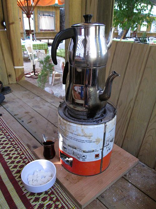Na trhu nakupujeme všechny potřebné potraviny, ale selháváme v tom hlavním – nikde nemají kebap! Ano, je to až k neuvěření, ale mimo město tady prostě kebap neseženete. Místo toho tedy dlabeme gözleme, což jsou jakési plněné chlebové placky. Luxusním zážitkem je turecký čaj, extrémně silný a servírovaný do malých skleniček (vypil jsem ho spoustu a  fakt jsem se celkem motal). Tohle všechno můžete konzumovat zatímco se válíte na matracích u malého stolečku v jakýchsi čtvercových „povalovacích kójích“, což je možná jeden z nejlepších tureckých vynálezů. Další výhodou místního trhu je, že ačkoliv Antalye je turismem prolezlá, tady v horách se zas až tolik cizinců nevyskytuje, takže místní se chovají jako milí lidé a nesnaží se vám vnucovat věci, které nechcete, a naopak se vám většinou snaží pomoct, když se na něco ptáte. Jejich ochota pomoci má ale i své nevýhody, které se dají ve stručnosti shrnout do tří bodů: Zaprvé neumí anglicky a shánění tlumočníka zabere vždycky dost dlouho. Zadruhé mají snahu vymýšlet náhradní řešení vašich problémů, která většinou neodpovídají tomu, co chcete vy. Zatřetí mají velmi špatný pojem o vzdálenostech a směrech, takže místa, která jsou „200 metrů tamtím směrem“ jsou často kilometr daleko uplně jiným směrem, případně vůbec neexistují.