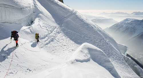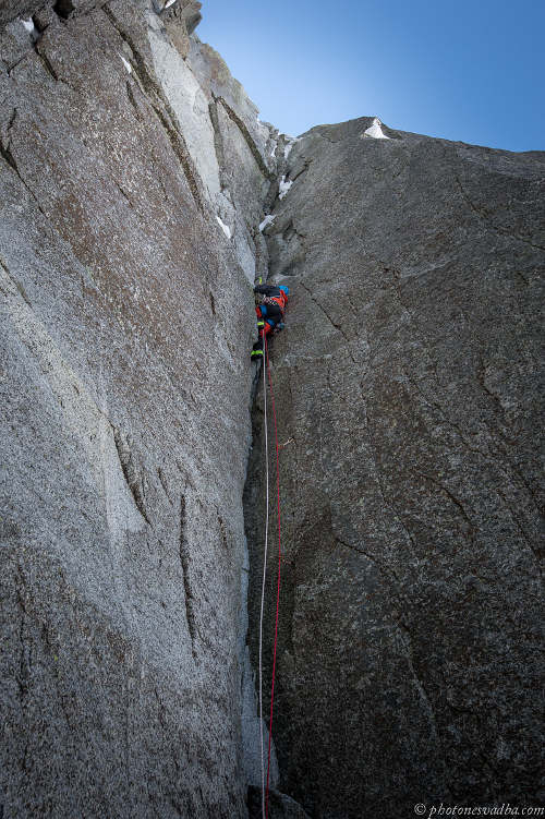 S heslem "alpinistas" a s nezlomitelně sebevědomým pohledem štěbetáme něco o holkách a opravdu dobře namíchaných kartách, hlavně co se týče slunka, bezvětří a (mírných) teplot. Cesta pod stěnu přes ledovec a dvě kratší slanění proběhnou v pohodě.