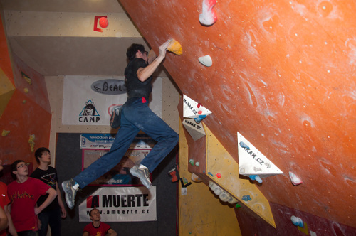 Finále začalo kolem 15 hodiny. Sešlo se v něm 5 kluků a 5 holek, které čekali v každé kategorii 4 bouldery. Všichni začínali první pokus z izolace a poté se střídali v pokusech po dobu, kterou si na každý boulder sami určili. Někteří si zaslouží pochvalu za výdrž i za bojovnost. Na začátku finále jsem ještě panikařil- jen ať se mi pořádně rozřadí!- ale vše dopadlo dobře. Postupně padaly zóny i topy, přibívalo pokusů, diváci se bavili a já si to konečně užíval s nimi.