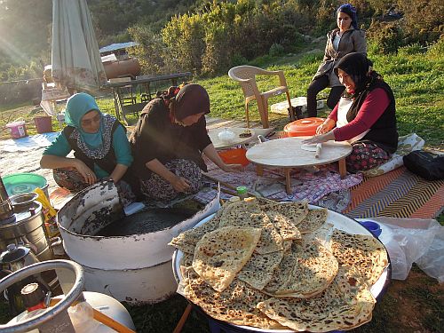 Babky "gozlemačky" v průběhu festivalu pekly a balily placky přímo pod skalami