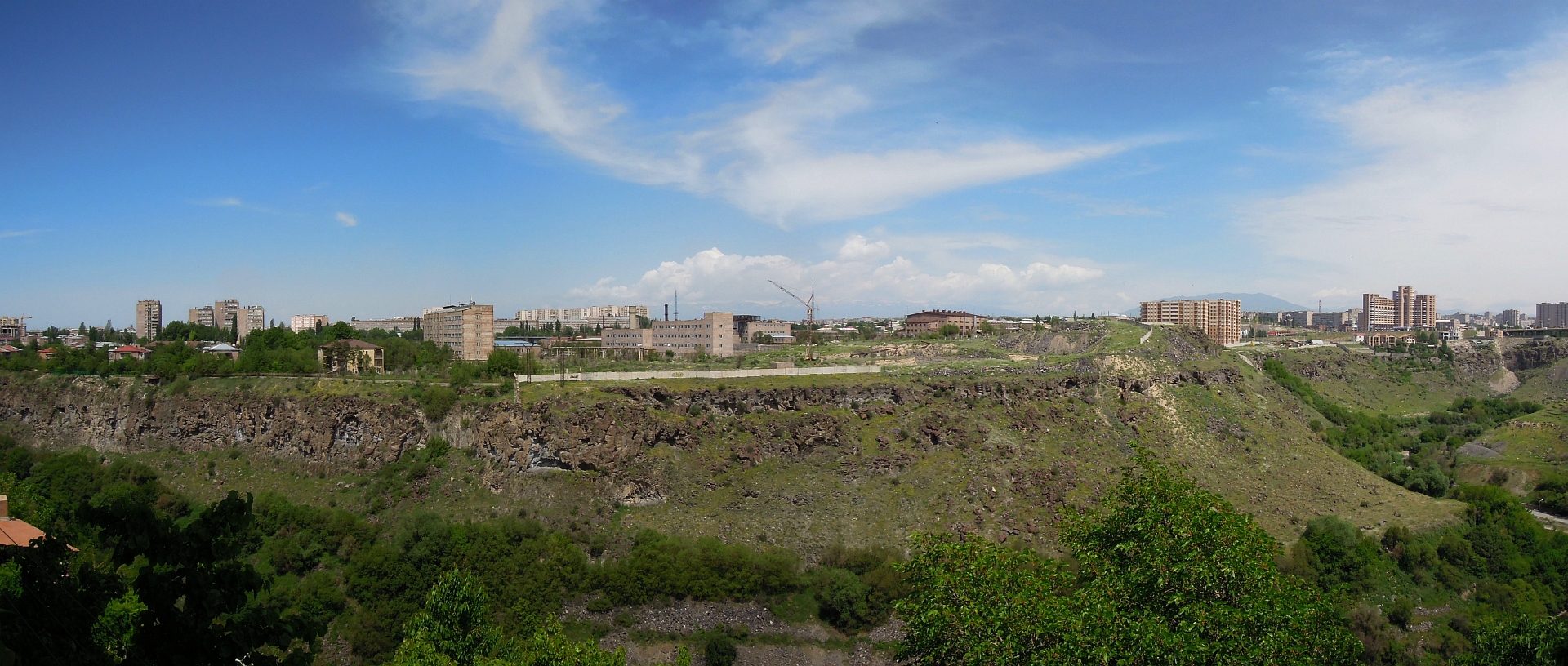 Pohled na údolí Hrazdan kaňonu, budovy v pozadí patří fyzikálnímu institutu - orientační bod