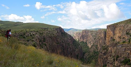 Druhý den jsme z našeho hostelu, který usazen přímo naproti Spitak centru nabízel nádherné výhledy z terasy na skalnatý kaňon, vyrazili směr Noravang, s krátkou zastávkou pro lezení v Hell's kaňonu.