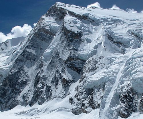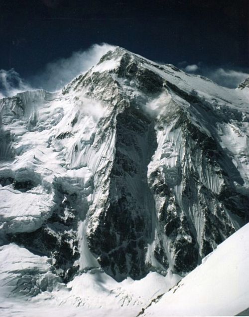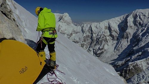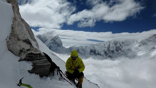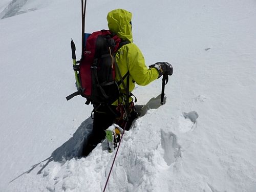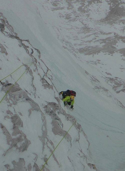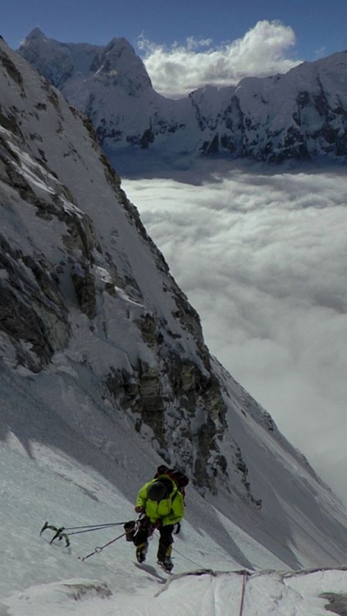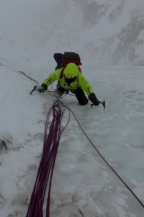 15.5. V 5hodin ráno již ukrajujeme první metry z následujících dvou a půl kilometrů. Kolem sedmé již narážíme na tvrdý vodní led, kterého se nezbavíme v průběhu dalších dní. Lezení je únavné, relativně vyrovnaně obtížné a vyžadující v každém kroku stálé soustředění. Ten den končíme po 14 hodinách „rachtání“ na vysekané poličce pod vysutým sérakem ve výšce 5900m.