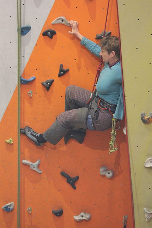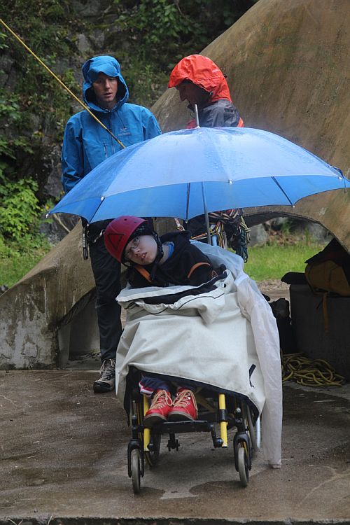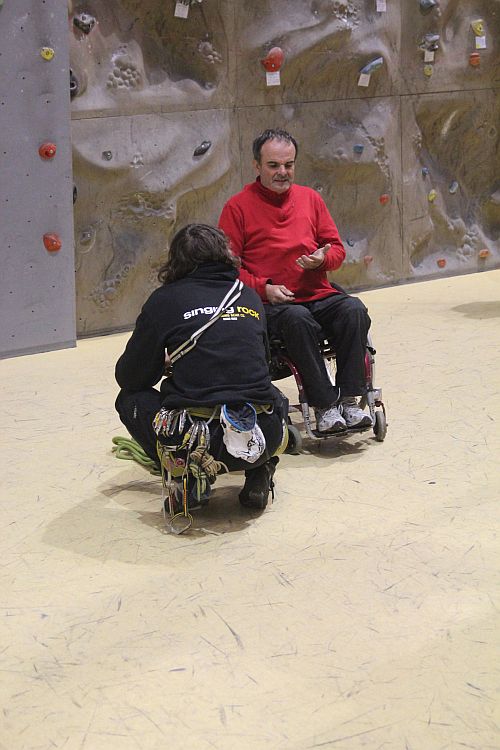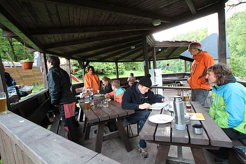 Dokonce i jedna cesta s názvem “Zle je, leje”, tuším za osm minus (nelezl jsem ji, měla na můj vkus moc provokativní název a stejně bych to nedal). Takže jsme lezli ostošet (toho nahoře jsem asi tímto taktickým manévrem nazlobili, protože to ostošest spustil venku). Co se ukázalo v lezeckém centru jako skvělé pro naše lezce s těžším pohybovým postižením, byla možnost lezení po ukloněné stěně, po hranách a komínem. Lézt komín bez rukou si zkusili i ti “zdraví” a zpotili se (ke svému údivu) víc, než při klasickém lezení. No a protože jsme v lezeckém centru byli několik hodin, bylo dost času i na metodickou výuku v podání Víti, pokec a i usušení věcí. Při zpáteční cestě už někteří usínali, takže si dali do těla. Zajištěná večeře v restauraci na Harrachovce byla skvělá, hlavně já jsem ocenil možnost mít místo tradičního singáčského guláše jahodové knedlíky. Co bylo pak? Jak to chodí. Sedělo se kolem stolu a kdo co vylezl, kdo kde hodil jakou tlamu, co nového v hardwaru, kam příště, kam nikdy, jak vyřešit Ivetinu chromou ruku se slaboučkým úchopem (návrhy od řešení typu fitnesových háků na suchý zip potažených gumou až po “instalaci” protézy v podobě zkráceného cepínu á-la drytooling), jaké úvazky pro vozíčkáře, a kdo ví co ještě. Došlo i na vyhodnocení den předtím vyhlášené soutěže (vítěz si odnesl via-ferratový set, jasně že od Singing Rock a jasně že ne ten stažený z prodeje) a bezpečnostního dovybavení přítomných lezců a lezkyň (člověk by neřekl, kolik taková lezkyně potřebuje kondomů...inu bezpečnost na prvním místě, jak sami říkají singáči). Jistě se řešilo i co a jak zítra. Na programu byla cvičná ferrata, přelanění.... Ale to bylo rozhodnuto za nás, jelikož venku zatím lilo a lilo a lilo. A proto už to dál o lezení není.