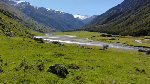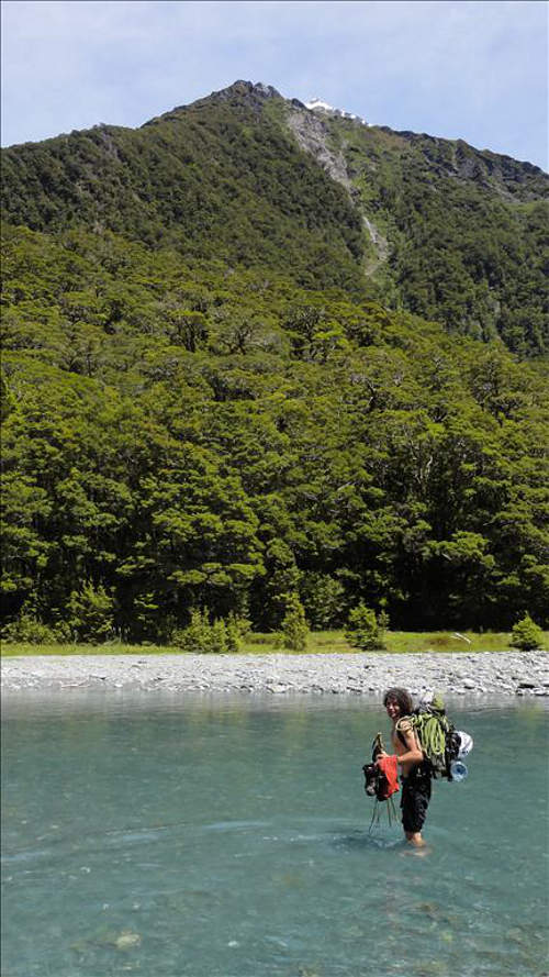 Aspiring je, ostatně jako většina místních vrcholů, vzdálen od civilizace až běda. Přístup k hoře je na jeden až dva dny poctivé chůze a člověk snadno pochopí, proč se zde často ke kopcům lítá hubschrauberem. My máme na celou akci 5 dní, den máme jako rezervu pro případ špatného počasí. Následující týden už šlapeme se Švadlou přes nekonečně dlouhé údolí Matukituki. Na vrcholcích kopců stále leží zbytky tajícího sněhu, který napájí četné vodopády, vše je po zimě zelené, horskou idilku dokresluje rozvodněná řeka protékající středem celého údolí a volně se pasoucí stáda krav a ovcí. Po nějakých patnácti kilometrech docházíme k místu, kde se dá kempovat. Vzhledem k pozdnímu startu se již začíná stmívat, chata French Ridge Hut je ještě několik hodin vzdálená s převýšením 800 metrů, stavíme stan. Záhy se ale ukazuje, jak blbé rozhodnutí to je. Stan stavíme za začínajícího deště a pod útokem stovek krvelačných sand flyes. Ráno to samé v bleděmodrém. Prcháme, jak to jen jde. Promočení docházíme k chatě a je jasné, že další pochod již není na pořadu dne.