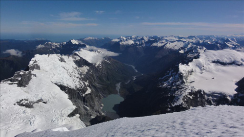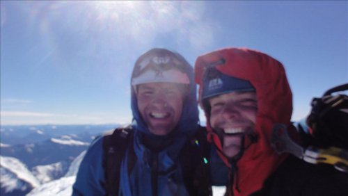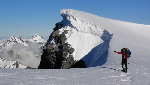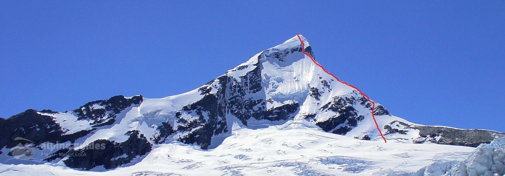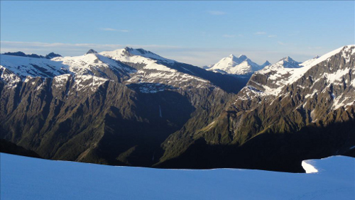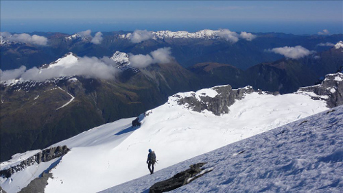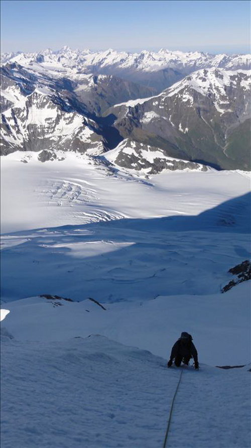 Jsme v první třetině hřebene v pásmu skal, kde nacházíme systém žlábků vedoucích skrz. Pak už jen přímo po hraně vzhůru. Sklon se s rostoucí expozicí pomalu zvyšuje, ale výrazné obtíže nikde. Monotónní lezení končí až na skalním prahu 150 metrů pod vrcholem, kde se musí překonat již zmíněný ledopád. Bez velkých potíží místo přelézám a po chvilce vykukuje zpoza hrany i Švadla. Balíme lano a dál opět sólo. Sklon se oproti předchozímu hřebeni stále napřimuje. Uvažuji o tahání délek, ale na tenkém firnu pokrývající skály by nešla zatlouct ani kotva a o šroubech není ani řeč. Lezení v tomto terénu na jednom špagátu se mi zdá jako zbytečný hazard, navíc se mi leze parádně. Švadla vypadá také sebejistě, a tak to pálím posledních padesát metrů, co to dá, ať se už můžu normálně postavit. Následujících deset minut ale hypnotizuji hranu, kde se má Švadla ukázat. Nikde nikdo. Lezu kousek zpět a naštěstí ho vidím již téměř na konci úseku. Zdá se ale, že také na konci svých sil. Očividně si hrábnul na dno. Na to že jsem čů....k, že jsem se na něj vy...l, nemůžu nic říct. S tím, že jsem měl na něj alespoň počkat, má pravdu. Na vrcholu hází falešný smích, ale výhledy brzy odnášení veškerou zášť. Je vidět West Coast, Mt. Cook, Mt. Tutoko i Remarky v domovském Queenstownu. Výstup nám trval necelé čtyři hodiny. Později se dozvídám, že pro Švadlu to byl první vážný výstup v horách a že byl zejména překvapen sólo charakterem celého výstupu. Pod kapucí bručím slova uznání k jeho výkonu.