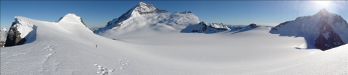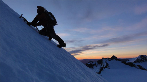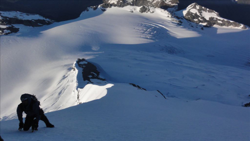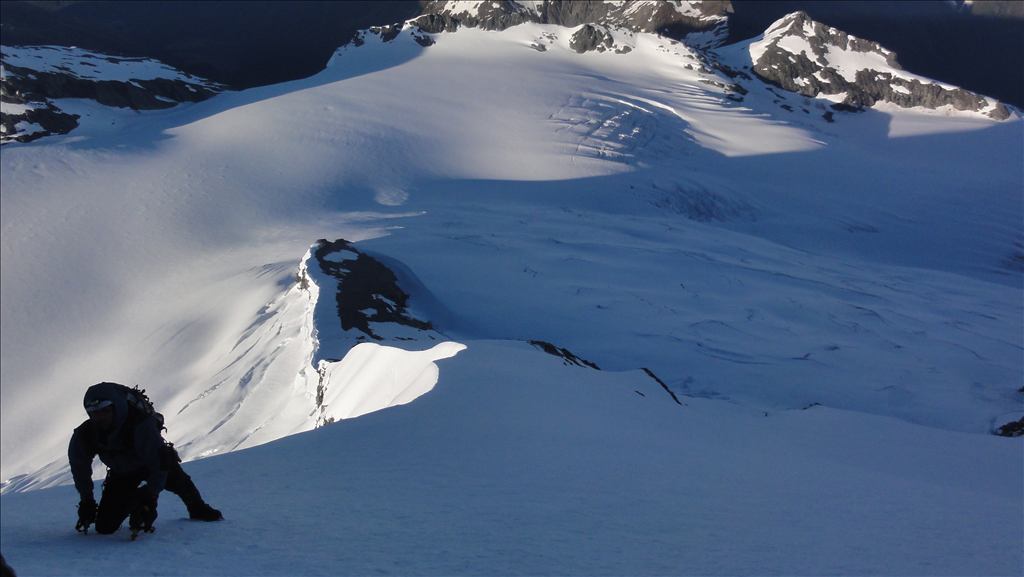 Stan opouštíme až ve čtyři, ale jsme první, tak nám alespoň nebude nikdo házet nic sníh na hlavu. Obcházíme hřeben z leva a za svitu hvězd stoupáme přímo k západní stěně. Šetříme tak spoustu času. Lézt začínáme v pět. Podmínky naprosto ideální. Tvrdý firn, sklon začíná na 45 stupních, tak valíme, co to dá. Cestu nám znepřimňují jen dvě masivní trhliny vedoucí napříč celou stěnou. Cestu skrz však nacházíme rychle.